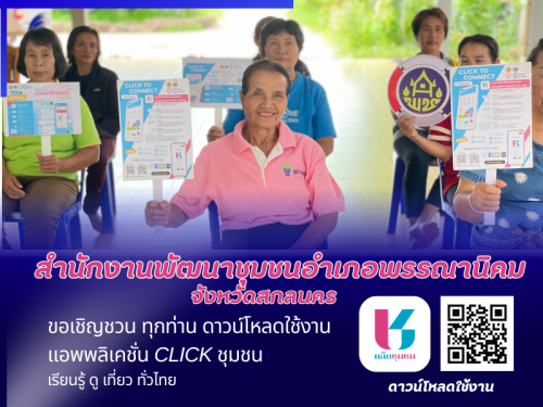 สำนักงานพัฒนาชุมชนอำเภอพรรณานิคม เชิญชวนใช้งานแอปพลิเคชั่น “Click ชุมชน” “เรียน รู้ ดู เที่ยวทั่วไทย ไปกับ Click ชุมชน”